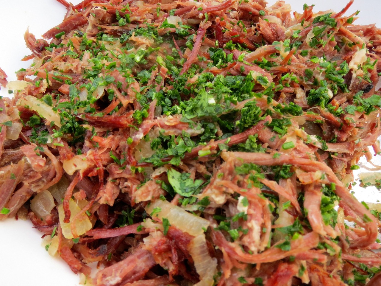 - Desfie a carne seca e reserve.
